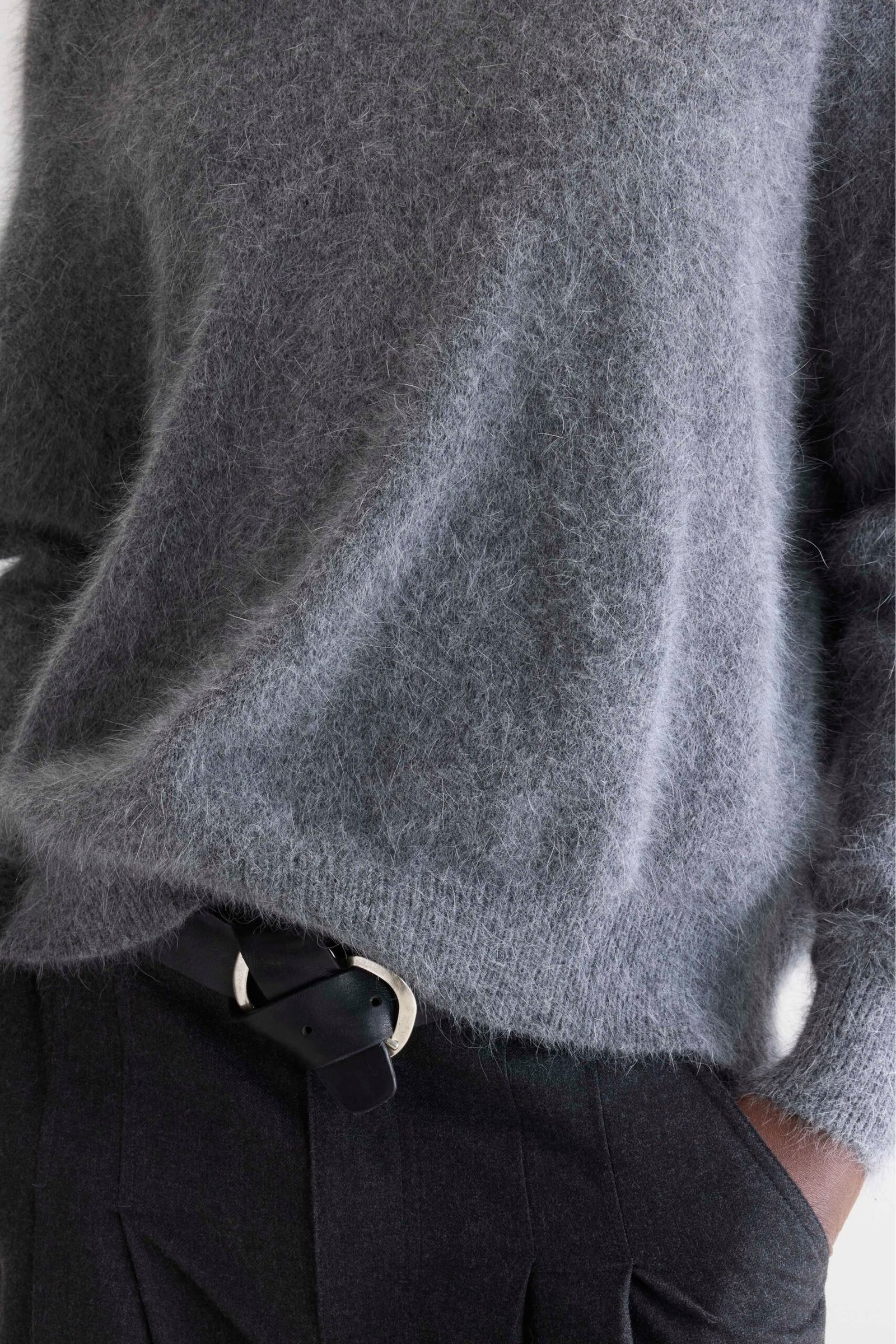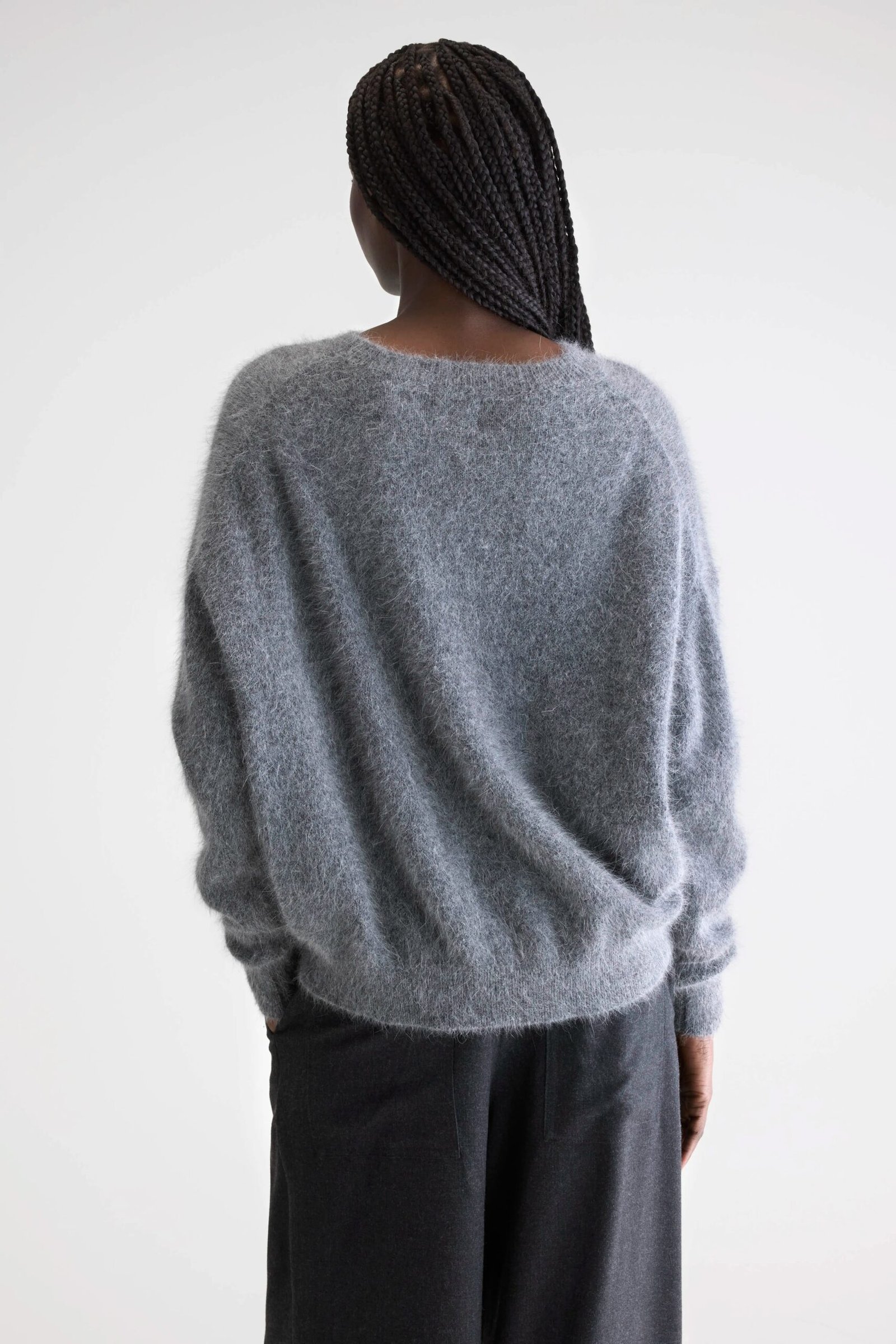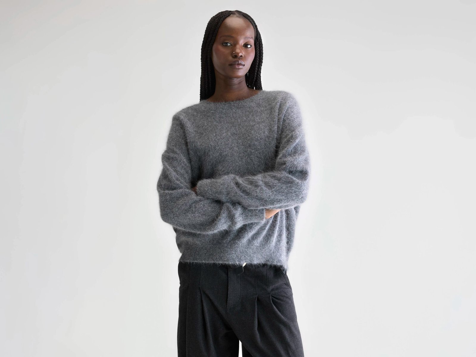 Oversized sweater with crewneck and long sleeves. crafted from a soft angora blend in mid-grey.