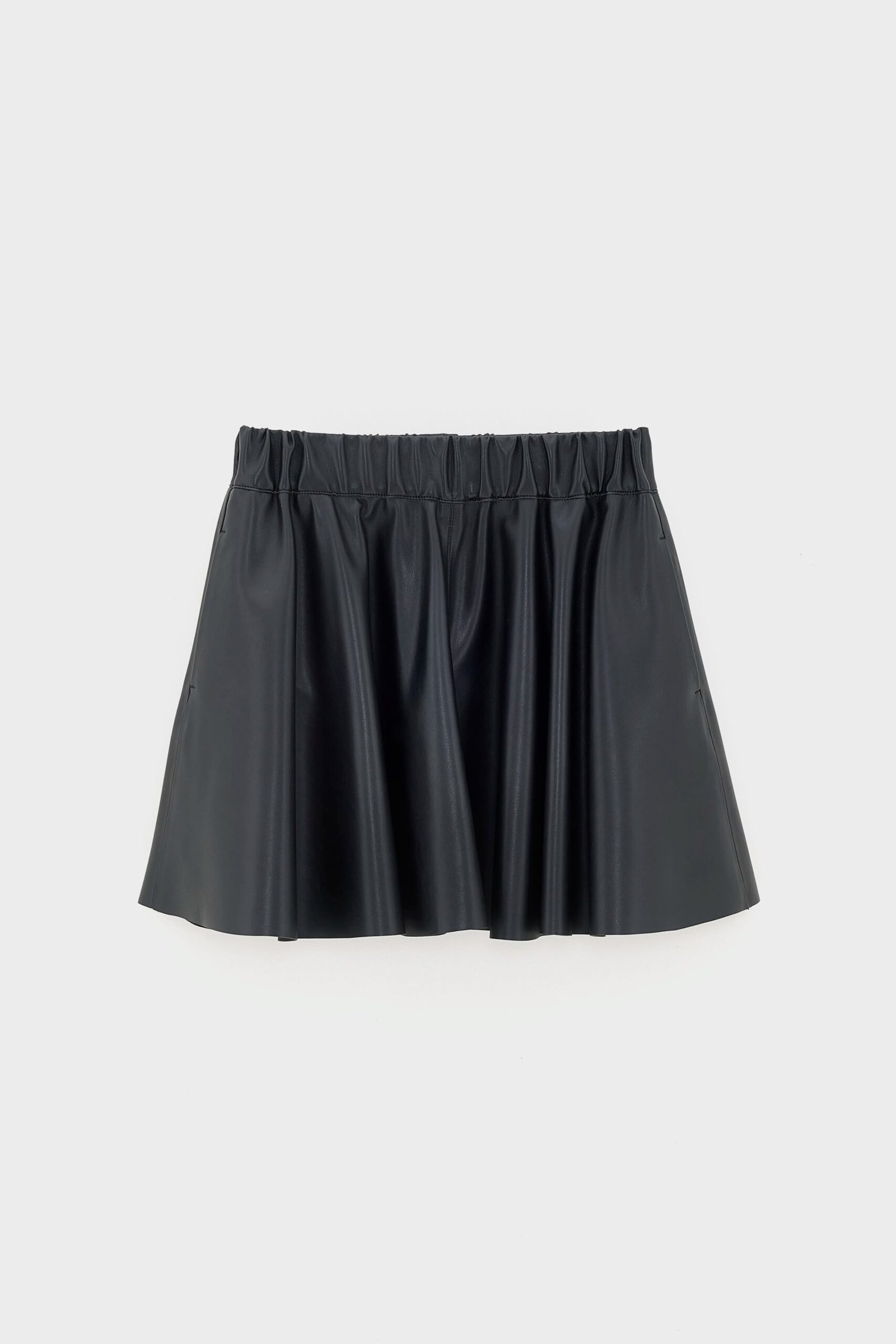 Black mini skirt in a suptle faux leather with a elasticated waistband and voluminous silouhette.