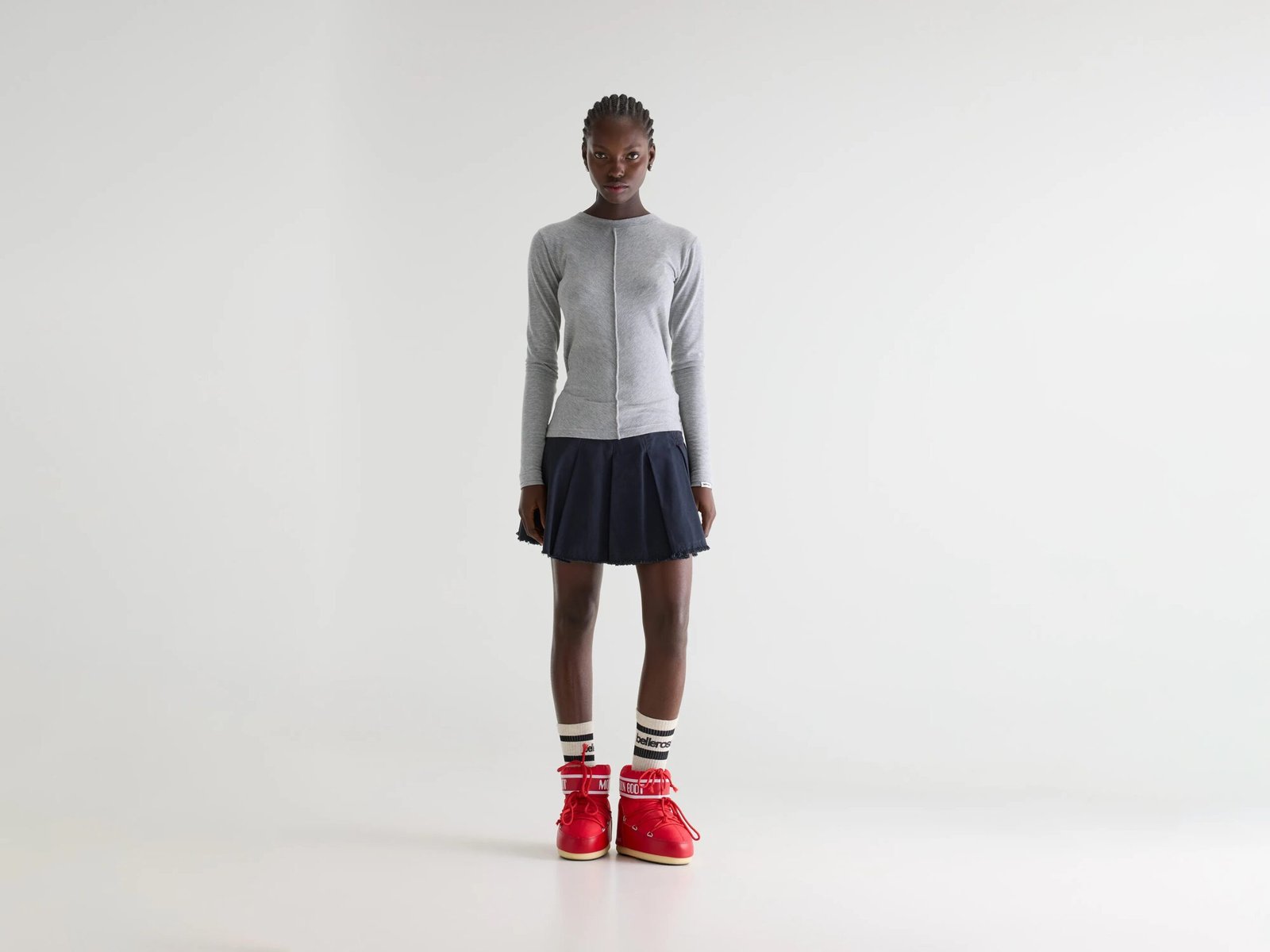 Pleated mini skirt in navy cotton with a flared silhouette. raw-cut hem. and side zipper closure.