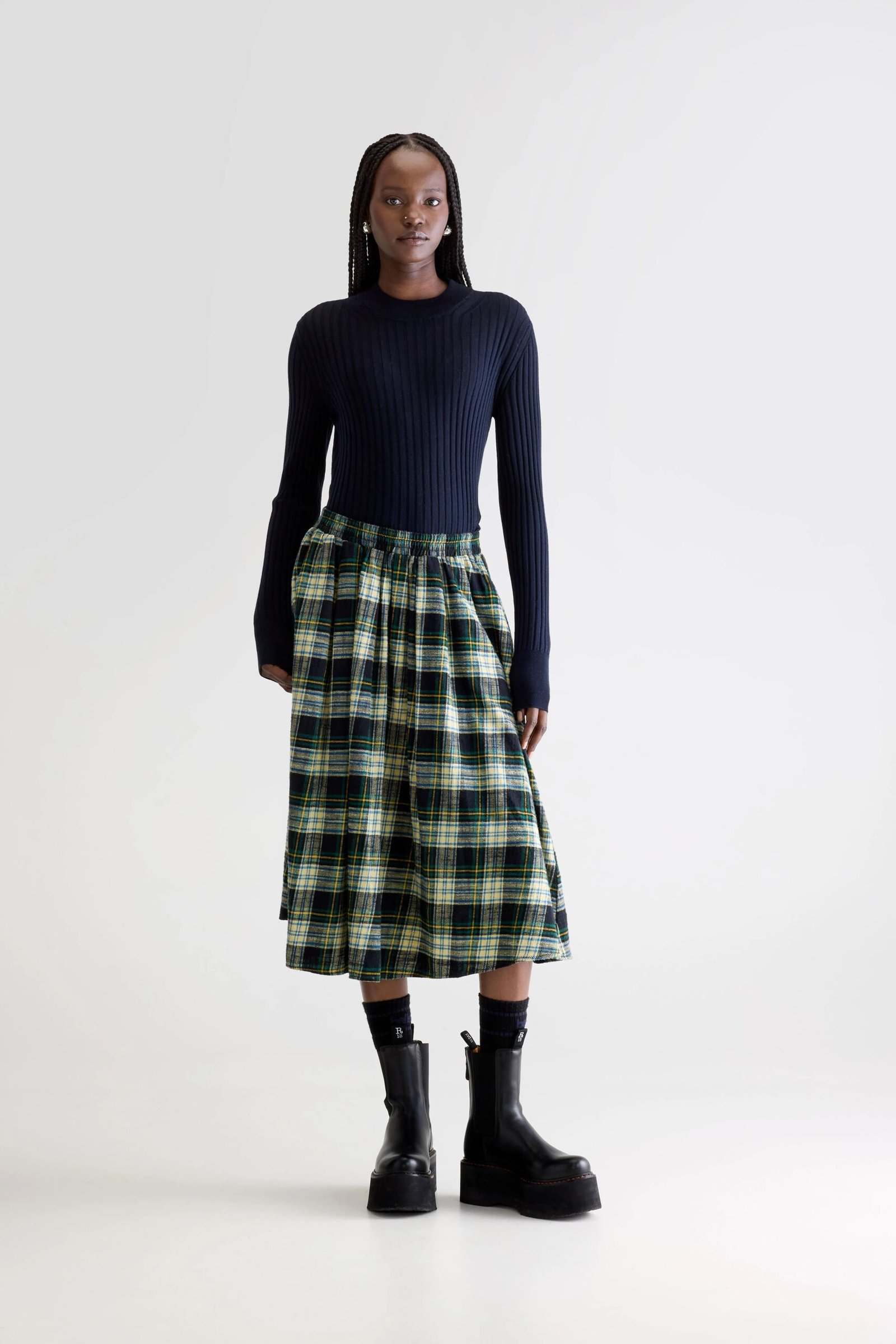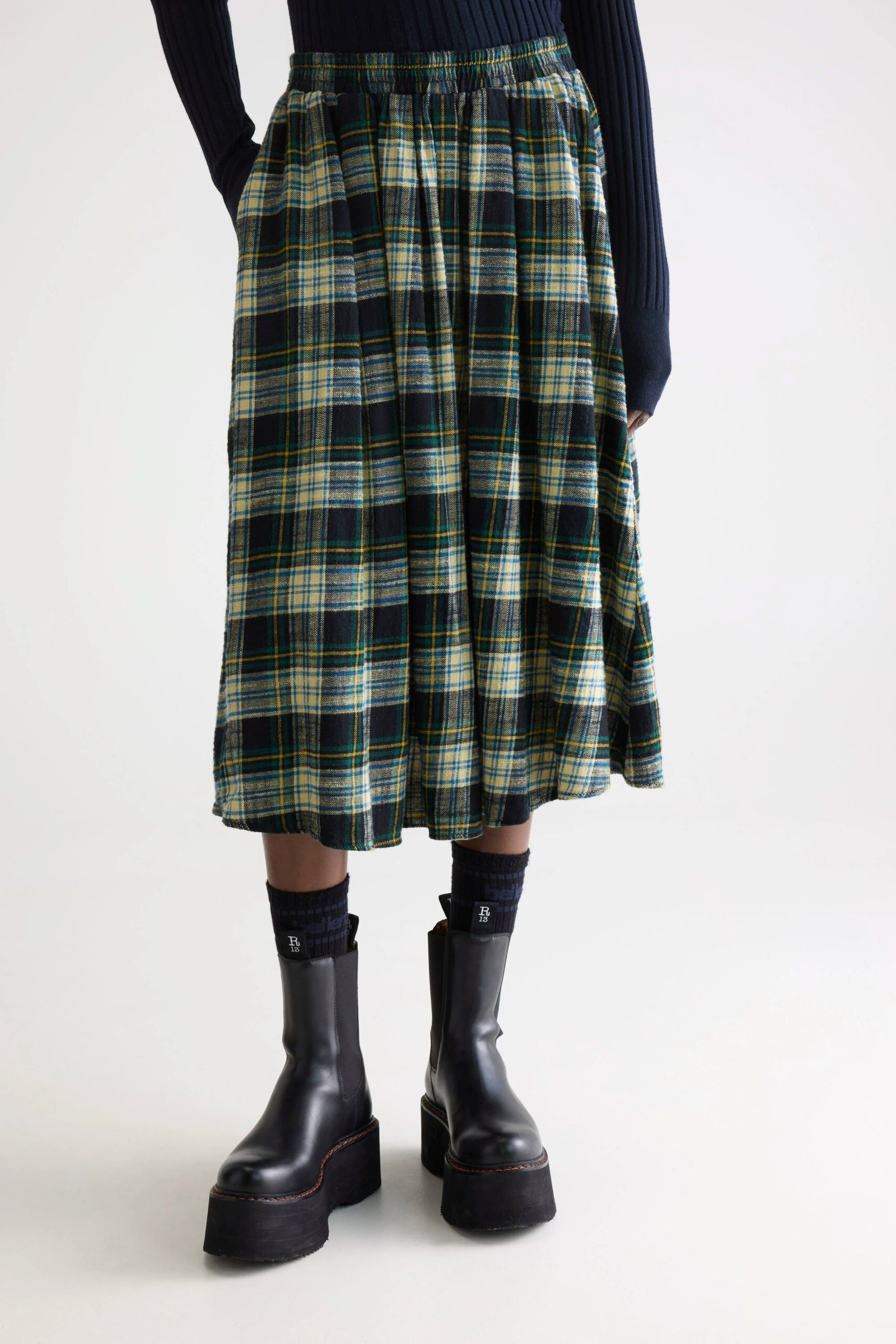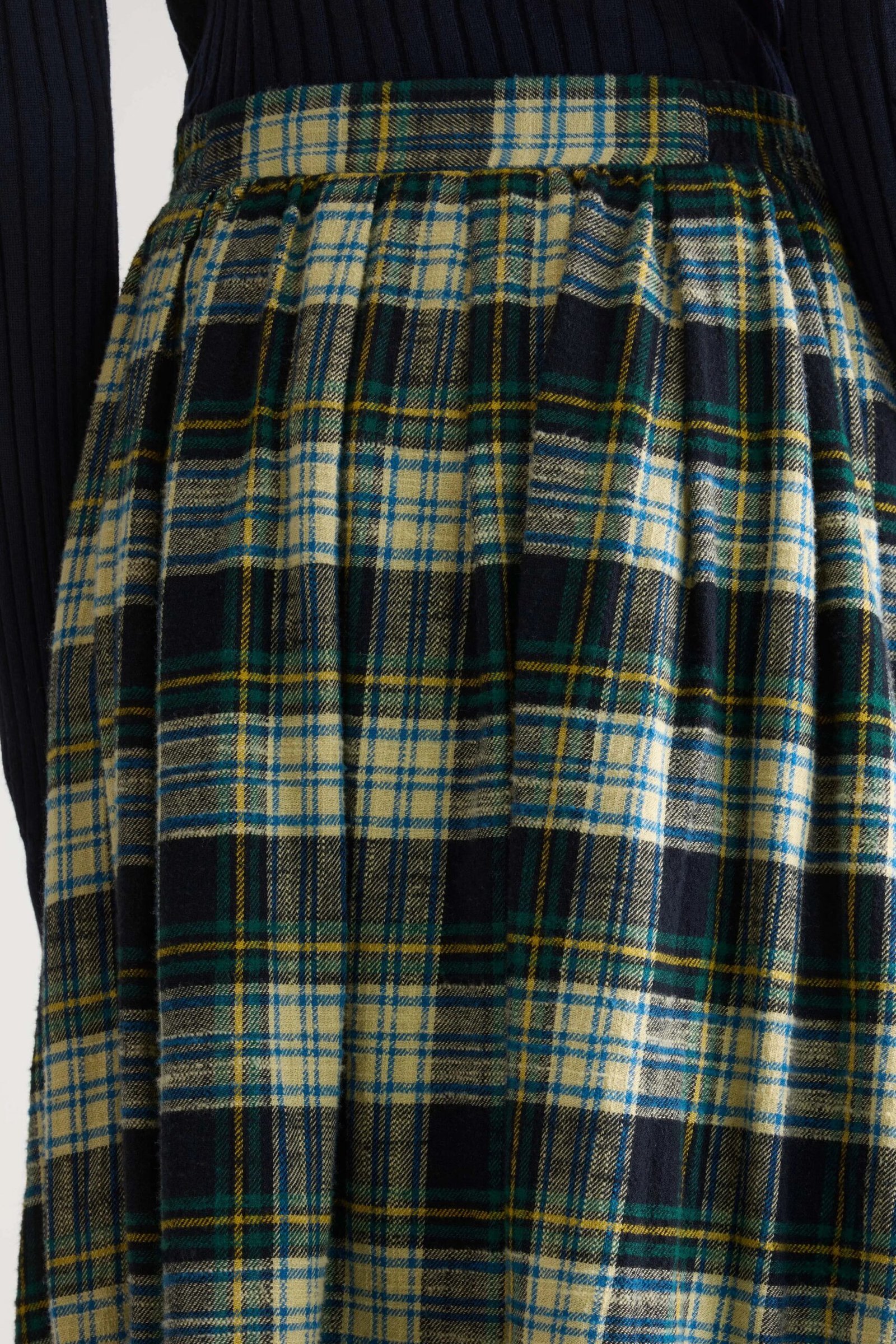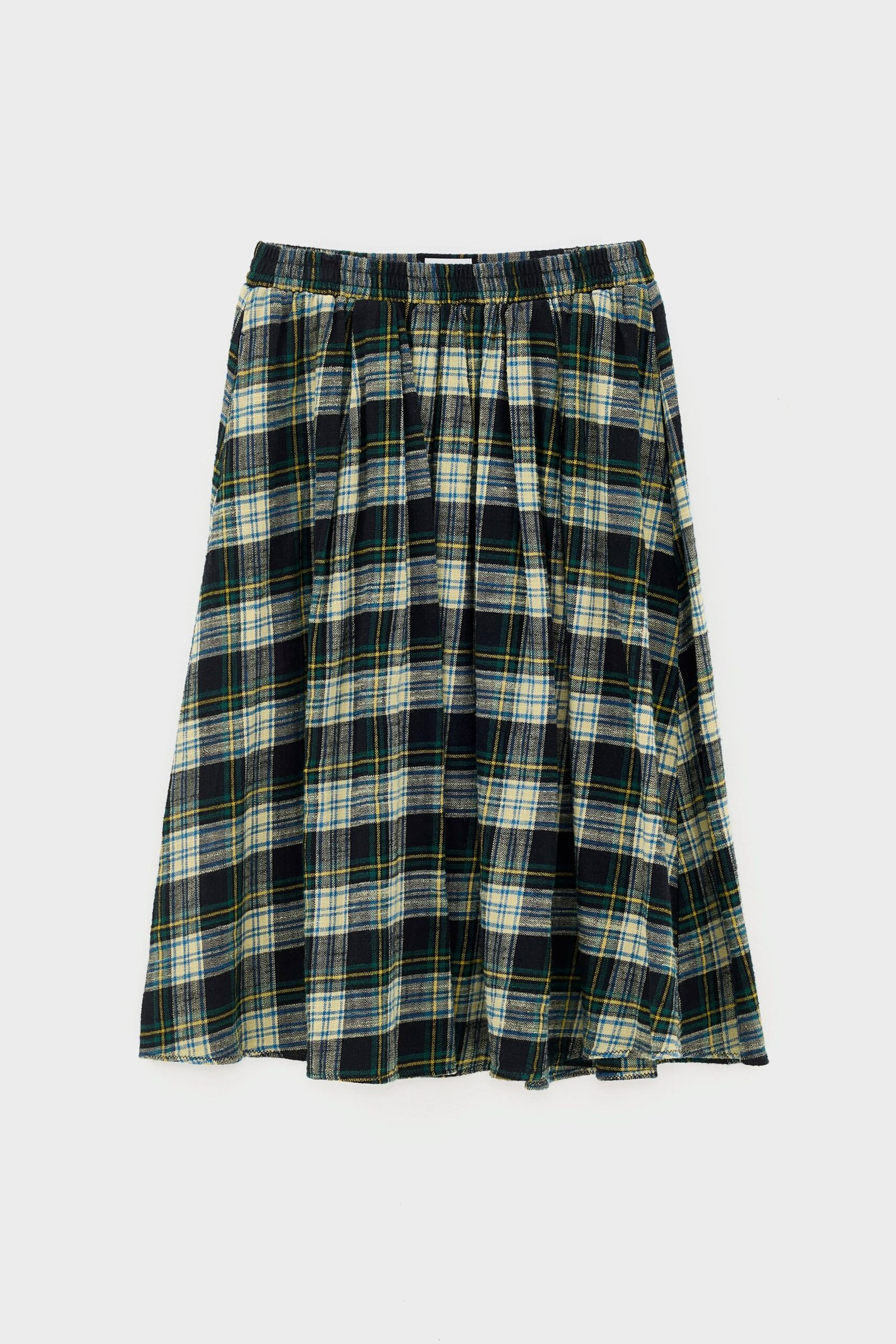 Tartan midi A-line skirt with a flowy silhouette. designed with a shirred elastic waistband for a comfortable fit.